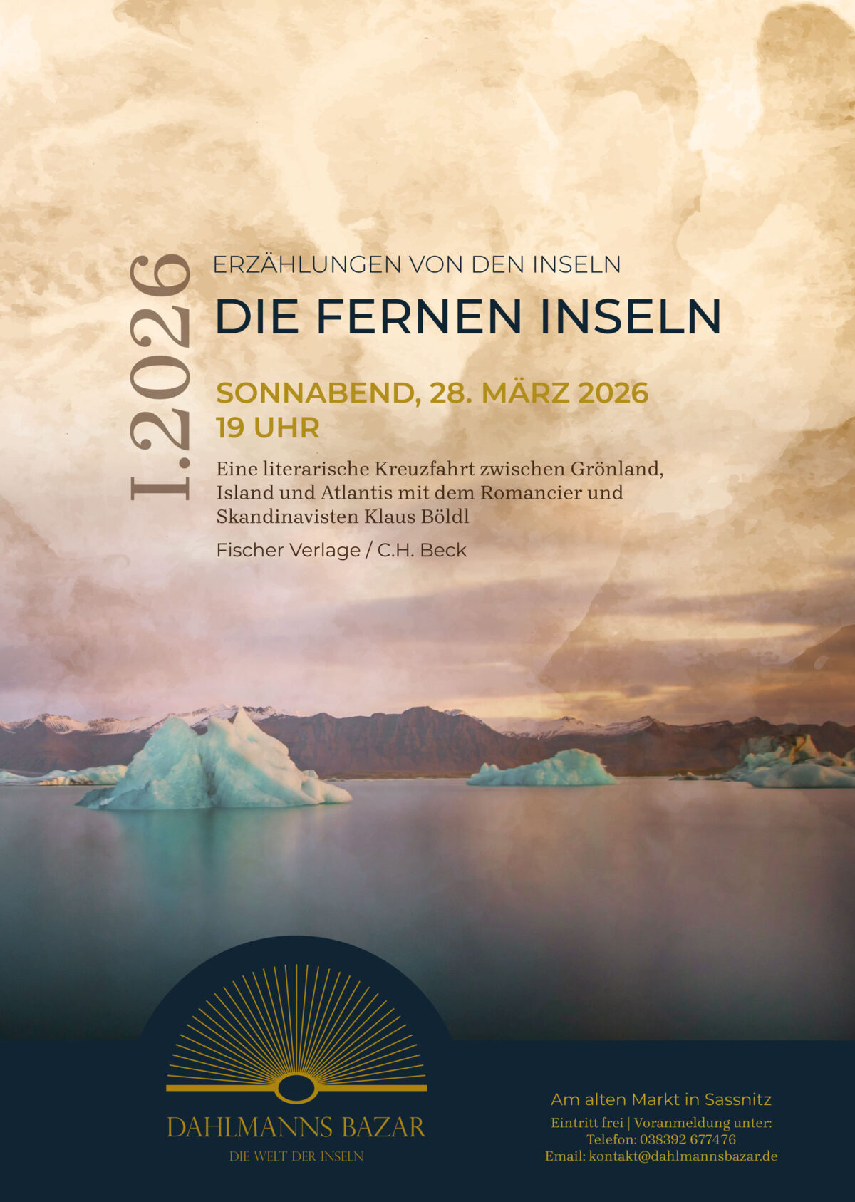 Der Schriftsteller, Skandinavist und Übersetzer Klaus Böldl bekundet in seinem literarischen wie in seinem wissenschaftlichen Werk eine Vorliebe für die Inseln des hohen Nordens. Grönland, Island und den Färöer hat er seit dem Romandebüt Studie in Kristallbildung von 1997 mehrere Prosatexte und Reiseberichte gewidmet, zudem trat er als Herausgeber isländischer Sagas und zeitgenössischer Literatur aus Skandinavien sowie mit Grundlagenwerken über nordische Götter und Mythen hervor. Seine Lesung in Dahlmanns Bazar spannt einen Bogen über sein in drei Jahrzehnten vorgelegtes literarisches und populärwissenschaftliches Werk, wobei neben dem aktuell viel diskutierten Grönland sowie Island und den Färöer auch Spekulationen über ein im hohen Norden zu suchendes Atlantis sowie eben dort vermutete Inseln der Odyssee eine Rolle spielen. Der Titel Die fernen Inseln entstammt einem 2003 erschienenen gleichnamigen poetischen Reisebericht über Aufenthalte auf Island und den Färöer.